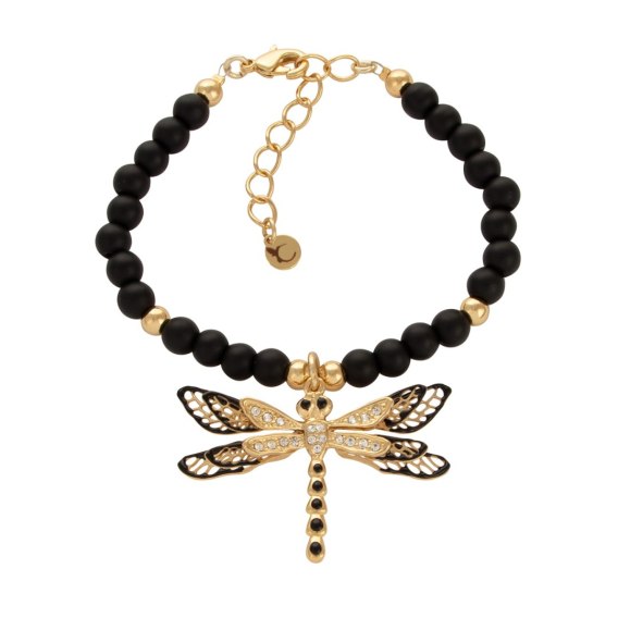 Bransoletka o długości 18 cm z przedłużką 4 cm. Wymiary ważki 3 cm x 4,5 cm. Zawieszka emaliowana ważka z kryształami. Naturalne kamienie onyksy w kolorze czarnym.