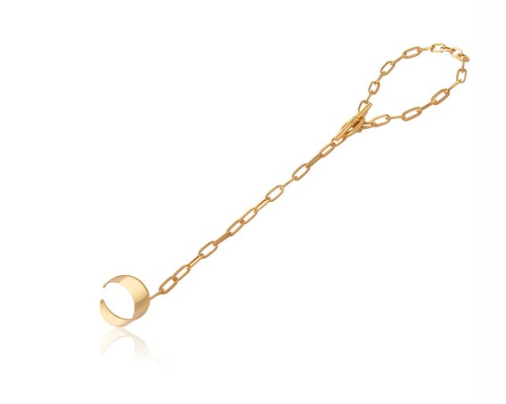 Pozłacana bransoletka połączona łańcuszkiem z gładkim pierścionkiem na palec.