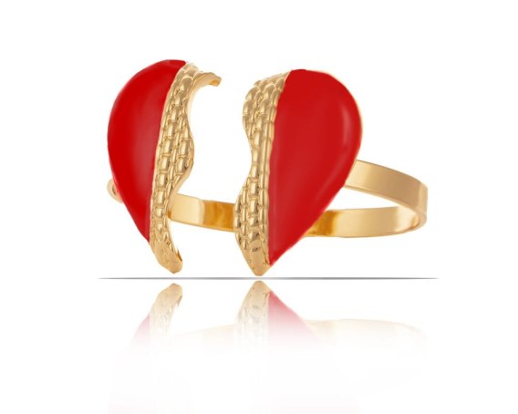 Pozłacana, ręcznie malowana na czerwono bransoletka połówki serc.