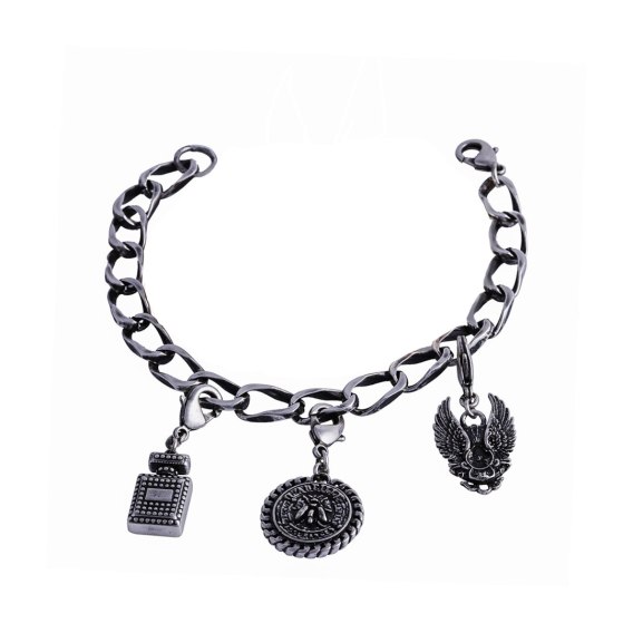 Bransoletka z łańcuchem typu pancerka. Długość bransoletki wynosi 19 cm. Zawieszki: nieśmiertelnik, krzyż, moneta z muchą, skrzydła, flakon perfum.
