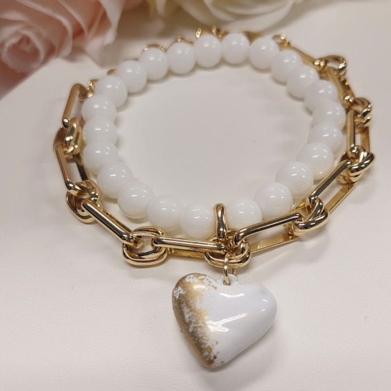 Pozłacana bransoletkar z agatami i łańcuchem , z ręcznie malowanym, biało złotym sercem. Bransoletka na gumce, długość łańcuszka 19 cm + 4 cm przedłużki. Wielkość serduszka ok 2cm/ 2 cm.