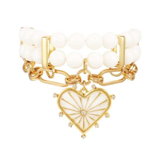 Pozłacana bransoletka z agatów Colibra by Sviatlana z kolekcji BELLA, z ręcznie malowanym, białym sercem, zdobionym kryształkami Preciosa. Bransoletka jest uniwersalna, gdyż jest na gumce. Wielkość serduszka ok 3,5cm/3,5 cm.