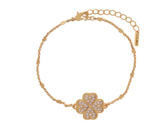 Delikatna bransoletka z zawieszką w kształcie czterolistnej koniczynki, całkowicie ozdobioną kryształkami Preciosa - subtelna i elegancka biżuteria, która doda blasku każdej stylizacji. Długość bransoletki 16 cm + 4 cm przedłużki.