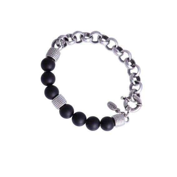 Bransoletka powstałą połączenia łańcucha "typu rolo" oraz koralików z Onyxu. Posrebrzana z efektem czernionym. Długość bransoletki wynosi 19,5 cm.