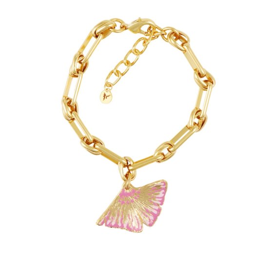 Pozłacana bransoletka z liśćmi, ręcznie malowanymi różową emalią. Długość bransoletki 17 cm + 4 cm przedłużki. Wielkość liścia ok 4,5 cm x 3 cm.