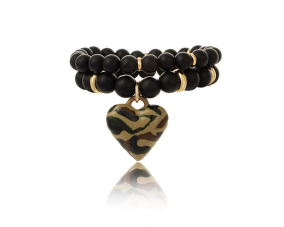 Zestaw dwóch, pozłacanych bransoletek z onyksów z ręcznie malowanym w odcieniach brązu moro sercem. Bransoletki są na gumce, więc są uniwersalne.