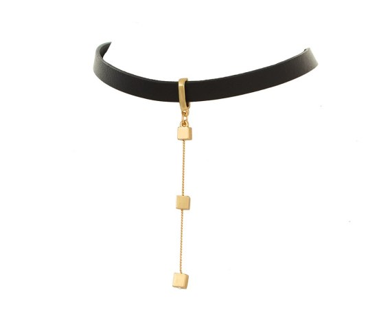 Pozłacany, skórzony choker z trzema sześcianami. Długość 36 cm+ 10 cm przedłużki.