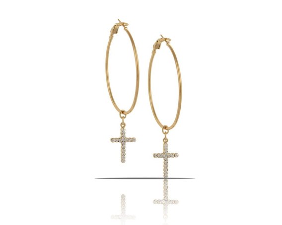 Pozłacane kolczyki koła z krzyżykami zdobionymi kryształkami Preciosa. Kolczyki koła o średnicy 4,5 cm. Wielkość krzyżyków 2 cm x 1,5 cm.