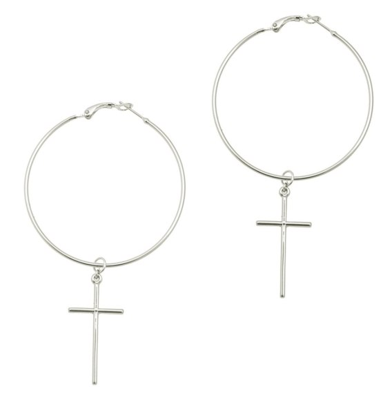 Kolczyki koła o średnicy 5cm z krzyżykiem. Przekrój długości 3,5cm, szerokości 2cm. Kolczyki posrebrzane.