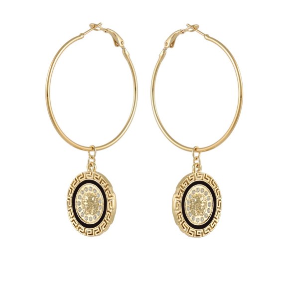 Kolczyki koła Colibra by Sviatlana z kolekcji OLIMPIA, z ręcznie malowaną na czarno grecką monetą zdobioną kryształkami Preciosa. Średnica koła 4,5 cm, średnica monetki 2,5 cm.