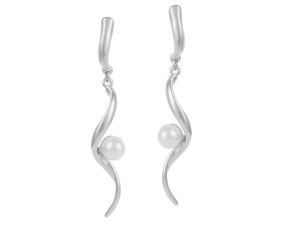 Posrebrzane kolczyki o oryginalnym kształcie z perłą. Długość kolczyka 5 cm.