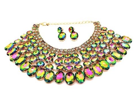 Naszyjnik plus kolczyki o pięknym zestawie kolorów, duże kształty dodają elegancji, pozwalają czuć się kobiecie zjawiskowo, wyjątkowo. W zależności od padającego światła zmienia swoją barwę. Mieni się kolorami.