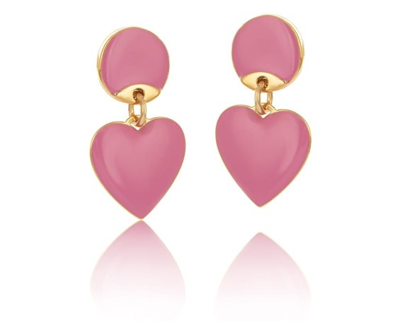 Pozłacane kolczyki z ręcznie malowanymi na różowo serduszkami na sztyftach. Długość kolczyków ok 3 cm.