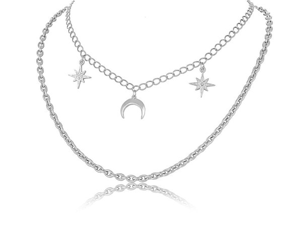 Posrebrzany, warstwowy naszyjnik z gwiazdkami i księżycem. Maksymalna długość naszyjnika 42cm. Dłuższy łańcuch bez zawieszek. Krótszy, cieńszy z zawieszkami.