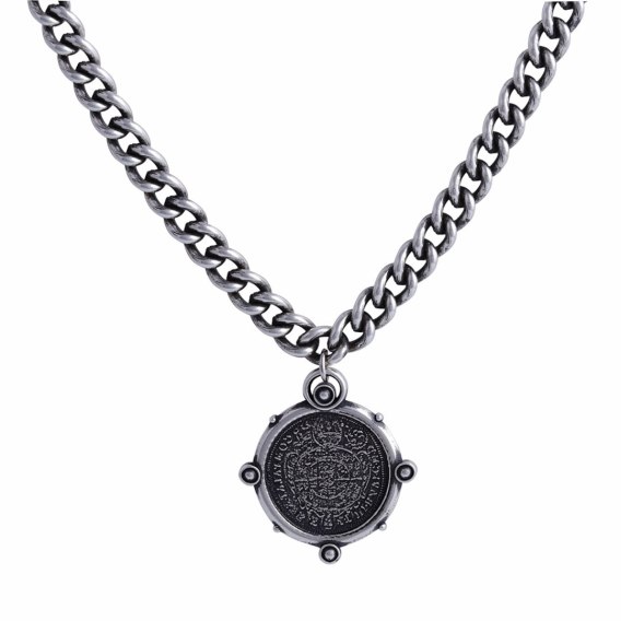 Naszyjnik posrebrzany/poczerniany męski z zawieszką/kompasem. Długość 55,0 cm, szerokość 0,7 cm. Średnica zawieszki 2,5 cm/3,0 cm. Waga naszyjnika 65,0 g.