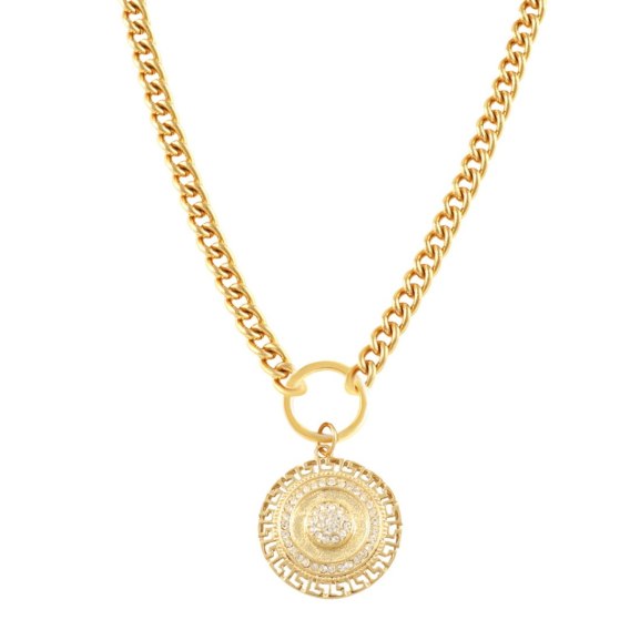 Niezwykle efektowny, pozłacany naszyjnik z monetą grecką wysadzaną kryształkami Preciosa. Długość naszyjnika wynosi 37 cm + 8 cm przedłużka, szerokość 0,5 cm. Wielość zawieszki 3,0 cm. Waga naszyjnika 44,5 g.